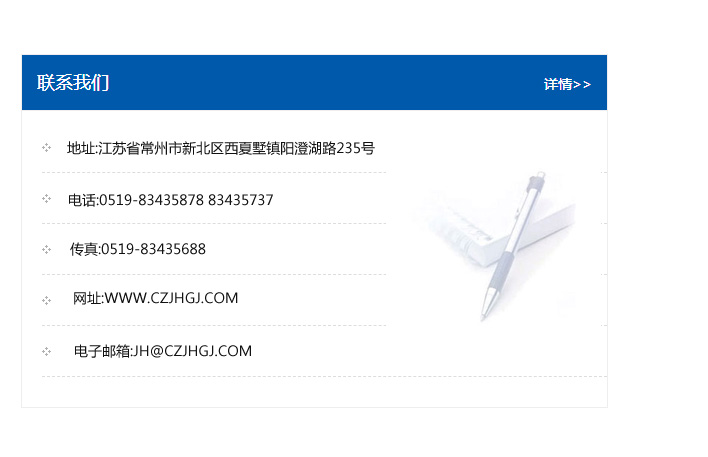 地址:常州市新北區友邦商務大廈1幢16、17層  電話:0519-85101652  傳真:0519-85112595  郵編:213022  網址:www_cz-jiayue_cn.wuhanhtzy.com  郵箱:xiajifengaa@163.com